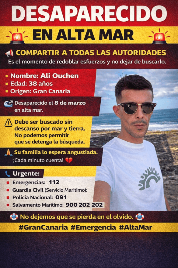 Ali Ouchen, de 38 años y originario de Gran Canaria, se encuentra desaparecido desde el pasado 8 de marzo en alta mar. Su familia, desesperada, pide ayuda urgente para encontrarlo y no perder la esperanza.
