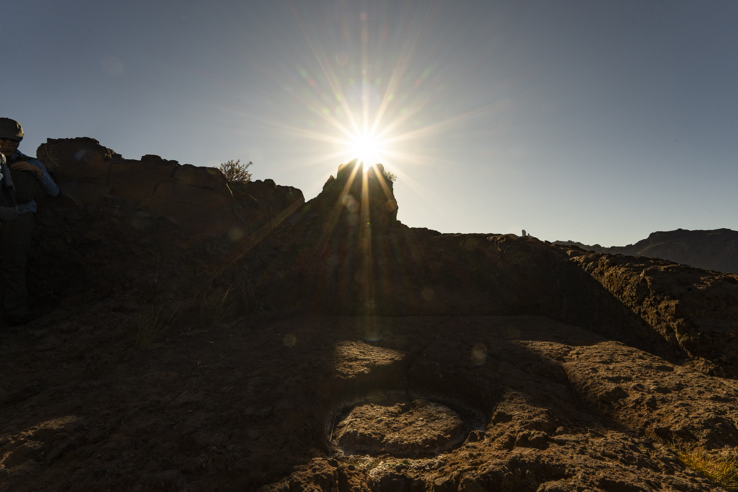 El Bentayga es un magnífico ejemplo de esta relación. Además de contemplar la salida de sol desde el espacio interpretado como almogarén, en este caso una estructura cuadrangular excavada, con una cazoleta y canalillos también labrados en la toba, la visita a este Bien de Interés Cultural permite entender la importancia que tuvo la cumbre de Gran Canaria tanto durante el poblamiento prehispánico de la isla, como en los momentos posteriores.