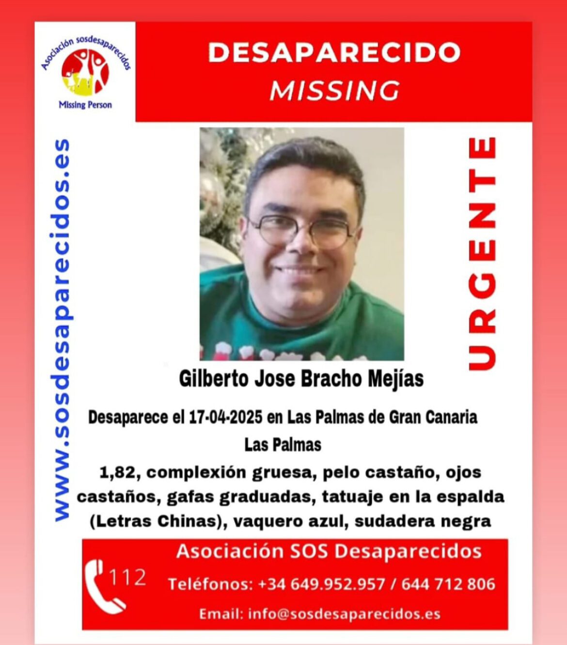 La Asociación SOS Desaparecidos ha emitido una alerta urgente para localizar a Gilberto Jose Bracho Mejías, desaparecido el pasado 17 de abril de 2025 en Las Palmas de Gran Canaria.