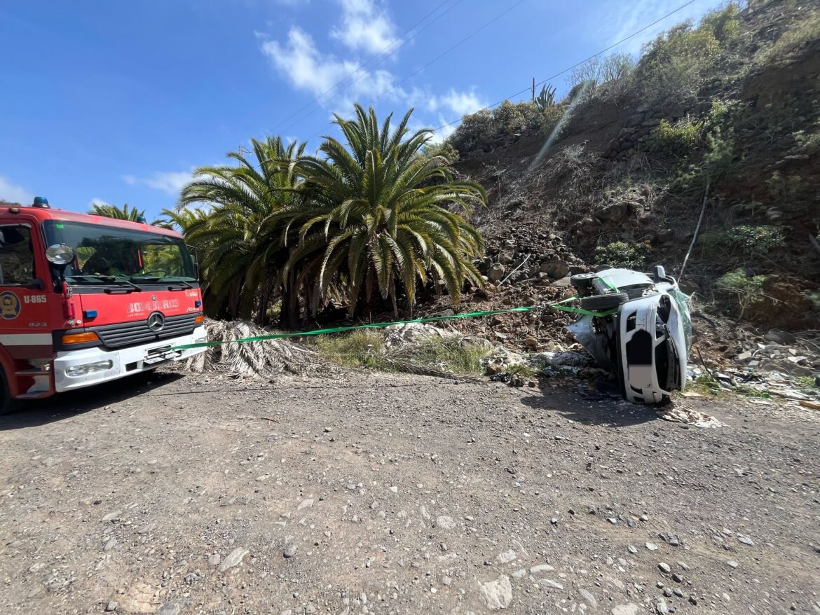 Un aparatoso accidente de tráfico se registró en la mañana de hoy en el barranco de Tamaraceite, cuando un vehículo cayó por una ladera, quedando volcado en una zona de difícil acceso.