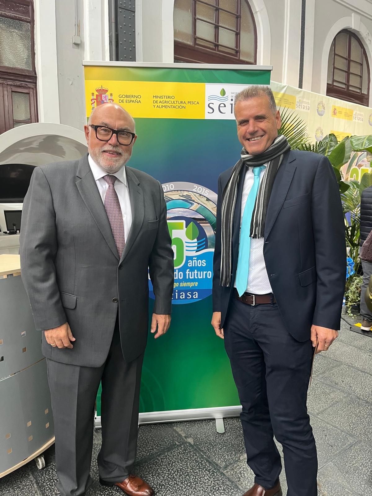 El consejero de Aguas del Cabildo de Lanzarote, Domingo Cejas, acudió como invitado, este viernes en Madrid, al acto del 25 aniversario de la Sociedad Mercantil Estatal de Infraestructuras Agrarias, S.A. (SEIASA), y tuvo la oportunidad de intercambiar impresiones con el ministro de Agricultura, Pesca y Alimentación, Luis Planas, sobre la obra de regadío del nordeste de Lanzarote, así como con el presidente de SEIASA, Francisco Rodríguez Mulero.