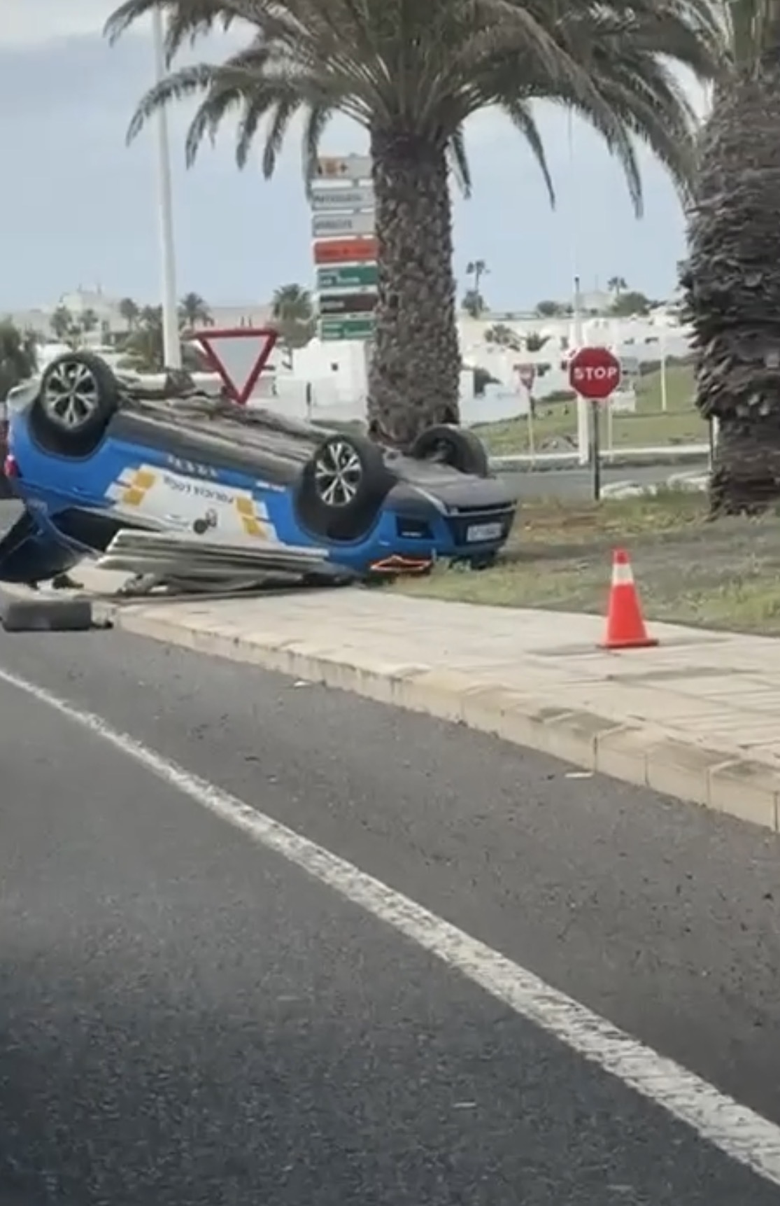 Un vehículo de la Policía Local de Tías ha volcado en la mañana de este viernes, 30 de enero, en la rotonda de acceso al parque Rancho Texas, situada en Puerto del Carmen.