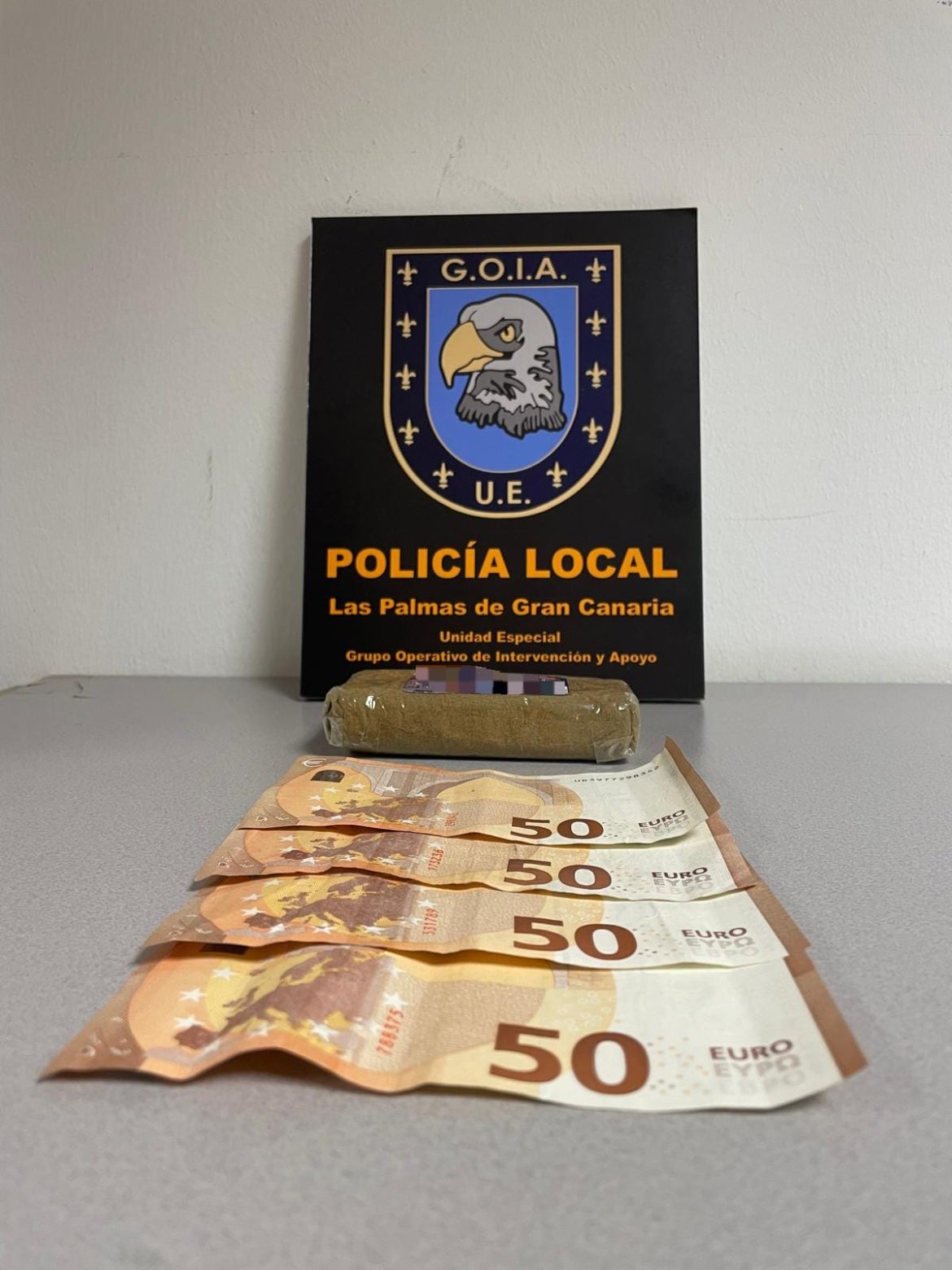La Unidad Especial del GOIA, en su labor contra el menudeo de droga, detuvo a las dos personas tras observar una transacción de hachís a cambio de dinero. 1 pieza de polen de hachís y 200€ intervenidos.