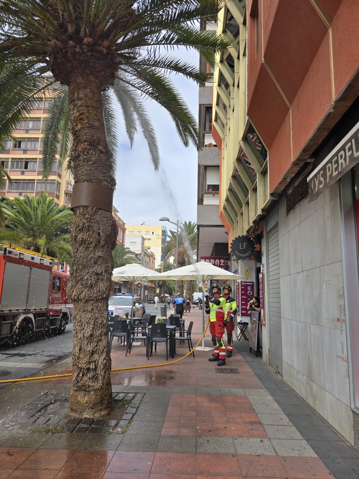 La rápida y eficiente intervención de los bomberos del parque zonal de Isleta y la colaboración de la Policía Local de Las Palmas lograron controlar de manera efectiva un incendio que afectó a una palmera en la calle Luis Morote, evitando así daños mayores.