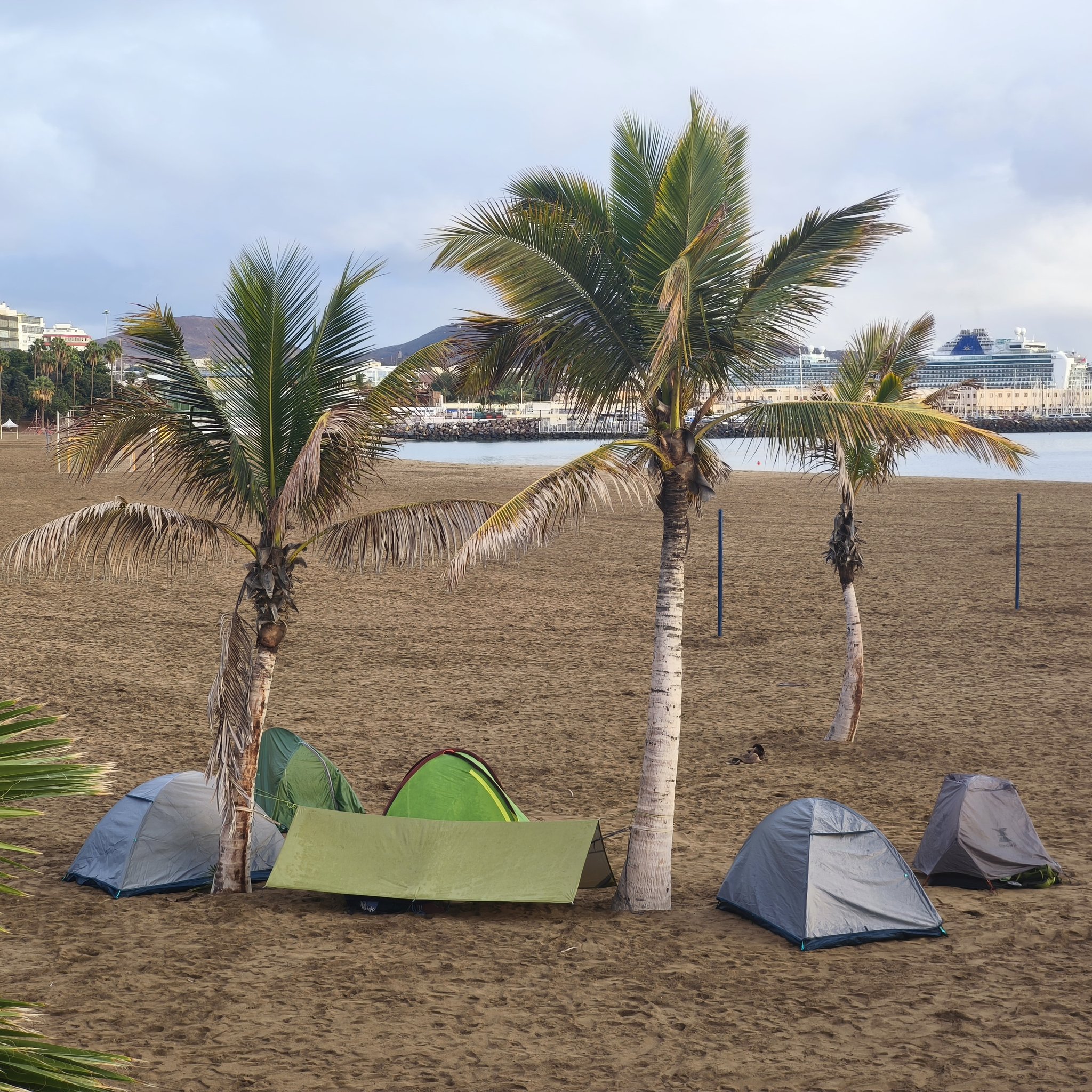 La estampa de la mañana en la playa de Las Alcaravaneras dejó una imagen tan llamativa como simbólica: un pequeño campamento improvisado instalado sobre la arena en la zona central del arenal, mientras al fondo destacaban dos enormes cruceros atracados en el puerto de la capital.