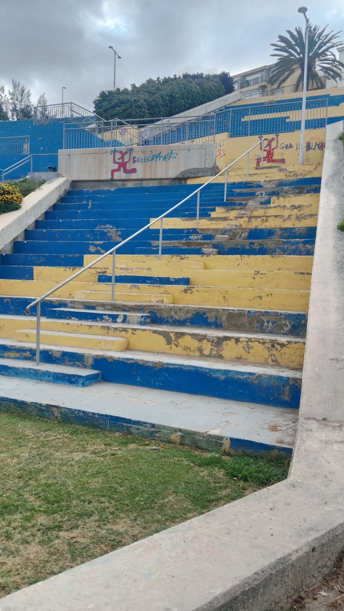 Lo que en su día fue un símbolo de pasión y orgullo futbolero hoy se ha convertido en una imagen de decadencia. Las gradas del antiguo campo de fútbol de la Unión Deportiva Las Palmas, pintadas en azul y amarillo, permanecen en estado de abandono, con la pintura desconchada, grafitis en las paredes y suciedad acumulada en los alrededores.