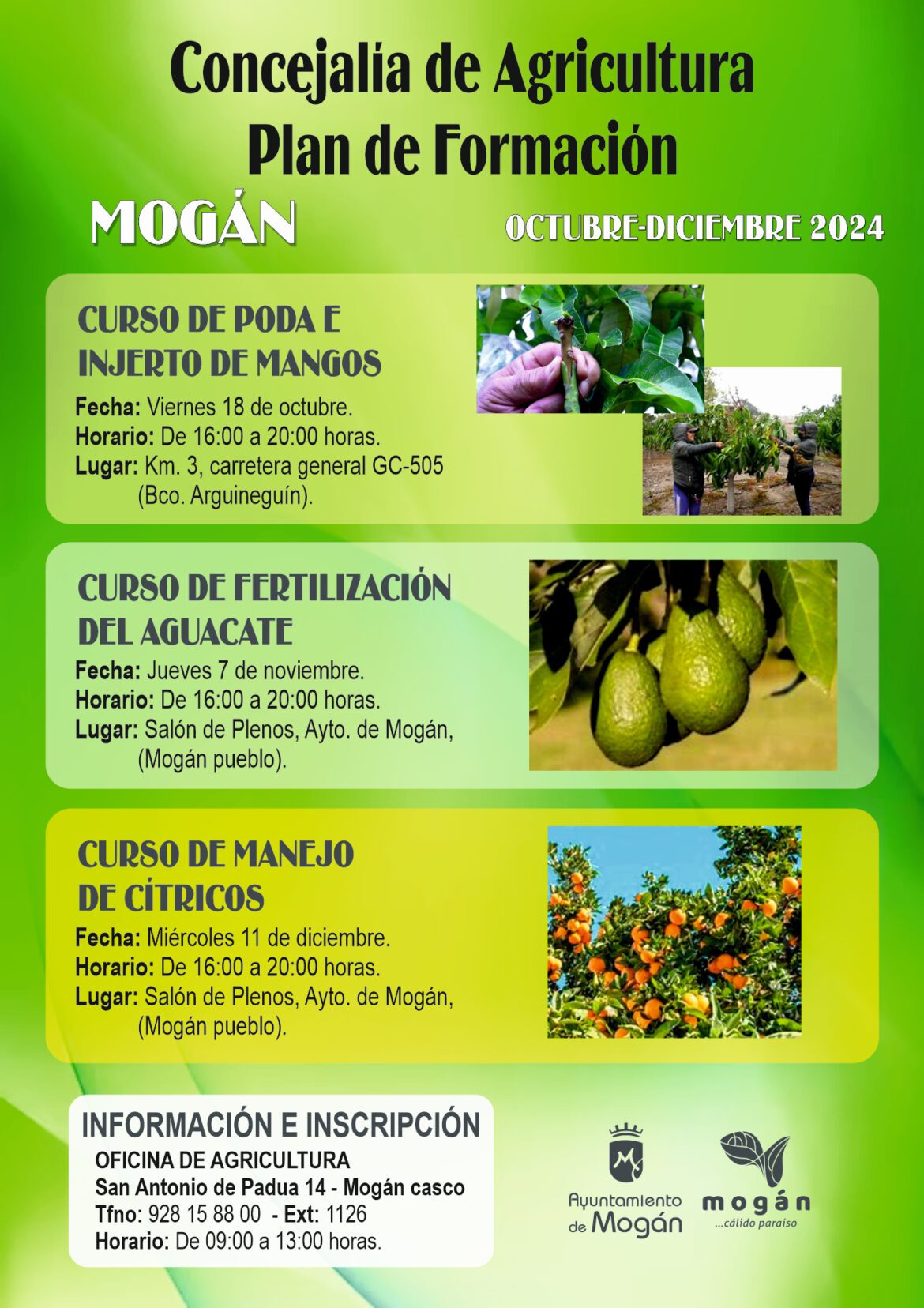 La Concejalía de Agricultura del Ayuntamiento de Mogán pone a disposición los cursos de poda e injerto de mangos, de fertilización del aguacate y de manejo de cítricos. Son gratuitos y requieren inscripción previa.