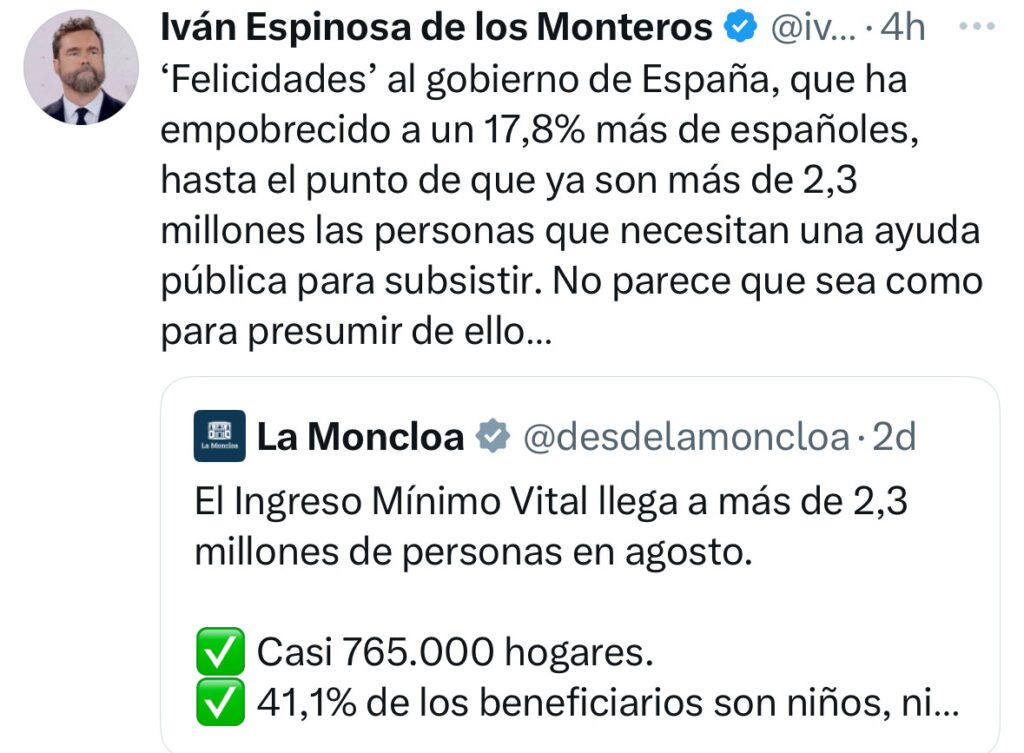 Sin embargo, desde la oposición se interpreta el incremento de beneficiarios como un reflejo del deterioro económico. Iván Espinosa de los Monteros, de Vox, escribió en la red social X (antes Twitter): “‘Felicidades’ al Gobierno de España, que ha empobrecido a un 17,8% más de españoles, hasta el punto de que ya son más de 2,3 millones las personas que necesitan una ayuda pública para subsistir. No parece que sea como para presumir de ello…”.
