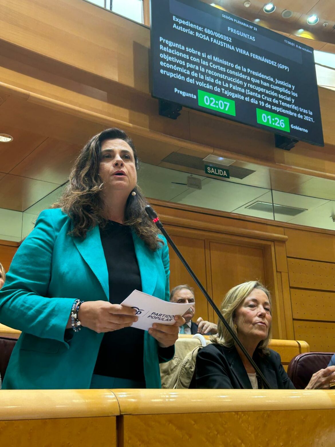 La senadora del GPP, Rosa Viera, denuncia los incumplimientos y retrasos del Gobierno en la reconstrucción de la isla de La Palma tres años después que el volcán entrase en erupción.