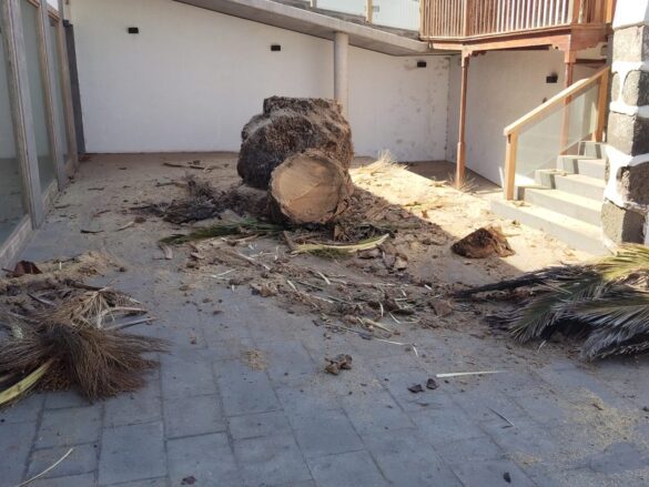 La palmera de la biblioteca pública se situaba en el propio patio, un lugar frecuentado por decenas de usuarios cada día. Mientras que la de la Casa de los Sall lo hacía justo al lado del edificio, su desplome hubiese supuesto la rotura del tejado y la pérdida de la instalación, que el Ayuntamiento estima abrir próximamente.