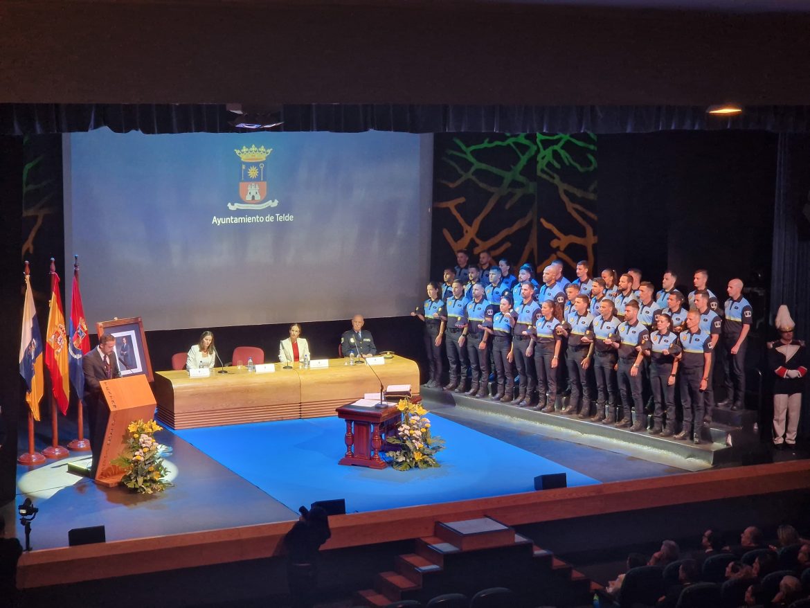 Telde cuenta ya con 33 nuevos agentes de la Policía Local, que estarán en prácticas hasta que concluyan el procedimiento de su formación. En la tarde de este lunes, fueron convocadas más de 500 personas en el Teatro Juan Ramón Jiménez -alcanzando el máximo del aforo del recinto-, para asistir al juramento o promesa de los nuevos miembros del cuerpo municipal. Acompañados de familiares y seres queridos, además del público en general, los recién nombrados policías locales fueron recibidos por el alcalde de la ciudad, Juan Antonio Peña, en la entrada del teatro.