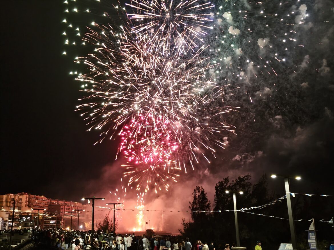 El día grande de las Fiestas de Melenara, organizadas por el patronato Chinchorro, ha concluido por todo alto con la concentración de unas 42.000 personas, entre teldenses y visitantes, que no quisieron perderse el espectáculo pirotécnico aéreo y marítimo que iluminó el cielo del barrio costero este sábado. Un total de 307 kilos de pólvora dieron paso a 16 minutos de fuegos artificiales que no dejaron indiferentes.