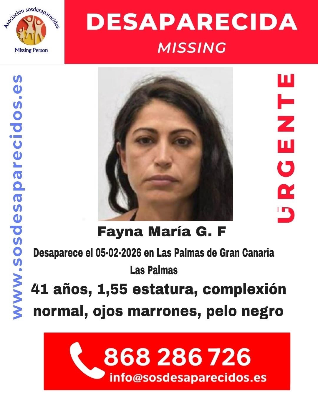 La asociación SOS Desaparecidos ha activado una alerta por la desaparición de Fayna María G. F., una mujer de 41 años, cuyo rastro se perdió el pasado 5 de febrero de 2026 en Las Palmas de Gran Canaria.