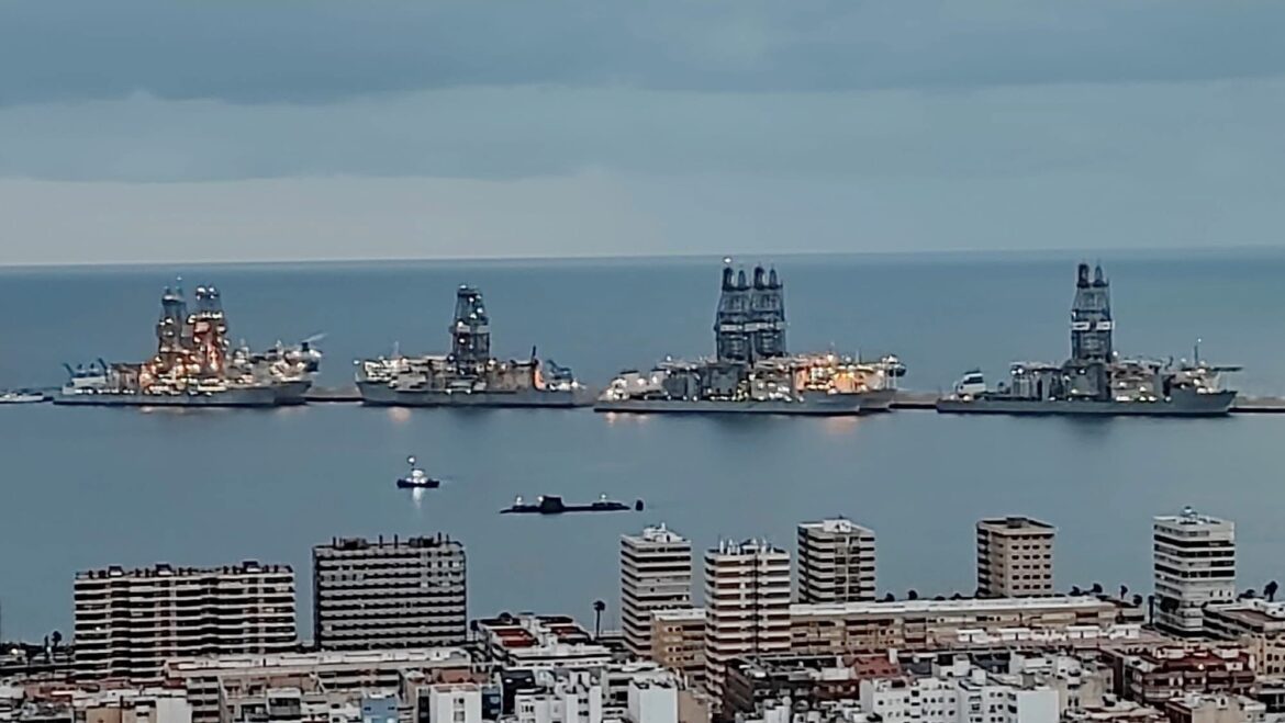 El moderno sumergible hizo escala en el puerto grancanario acompañado por unidades de apoyo, en una imagen insólita donde su silueta se recorta frente a un horizonte dominado por plataformas petrolíferas. La escena subraya la relevancia estratégica del archipiélago canario en el contexto geopolítico del Atlántico medio.