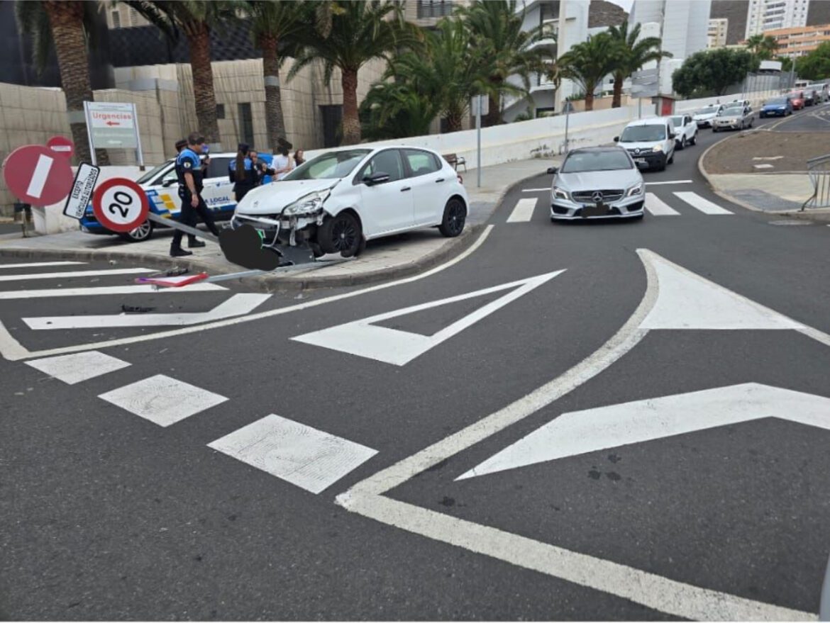 En la mañana de hoy, se ha producido un accidente de tráfico en las inmediaciones del Hospital Insular de Gran Canaria. Un vehículo particular de color blanco perdió el control y terminó impactando violentamente contra varias señales de tráfico situadas en una de las rotondas de acceso al centro hospitalario.