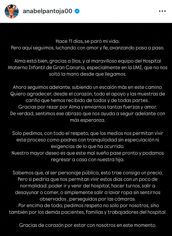 La influencer y personalidad televisiva Anabel Pantoja ha compartido un emotivo mensaje a través de sus redes sociales, agradeciendo el apoyo recibido durante los difíciles momentos que ha atravesado junto a su hija, Alma, quien se encuentra en recuperación en el Hospital Materno Infantil de Gran Canaria.
