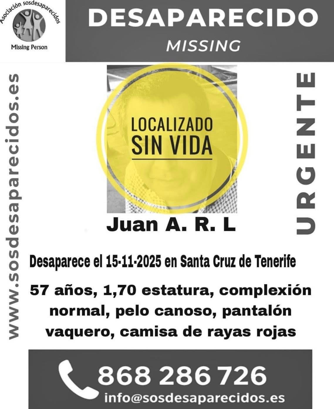 La Asociación Sosdesaparecidos ha confirmado la localización sin vida de Juan A. R. L., cuyo paradero se desconocía desde el pasado 15 de noviembre de 2025 en Santa Cruz de Tenerife.