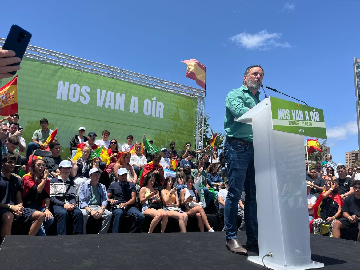 Este sábado, 1 de junio, el presidente nacional de VOX, Santiago Abascal, junto al candidato a las europeas, Juan Carlos Girauta, ha ofrecido un mitin en la Plaza del Castillo Negro, en Santa Cruz de Tenerife, arropado por el presidente provincial, Alejandro Gómez, el presidente de VOX en Las Palmas y candidato a las europeas, Nicasio Galván, concejales en los diferentes municipios, y consejeros del Cabildo Insular de Tenerife. Gómez ha dado la bienvenida a todos los allí presentes y ha enviado ánimo “para que el próximo 9 de junio VOX esté en el Parlamento Europeo con más fuerza que nunca”.
